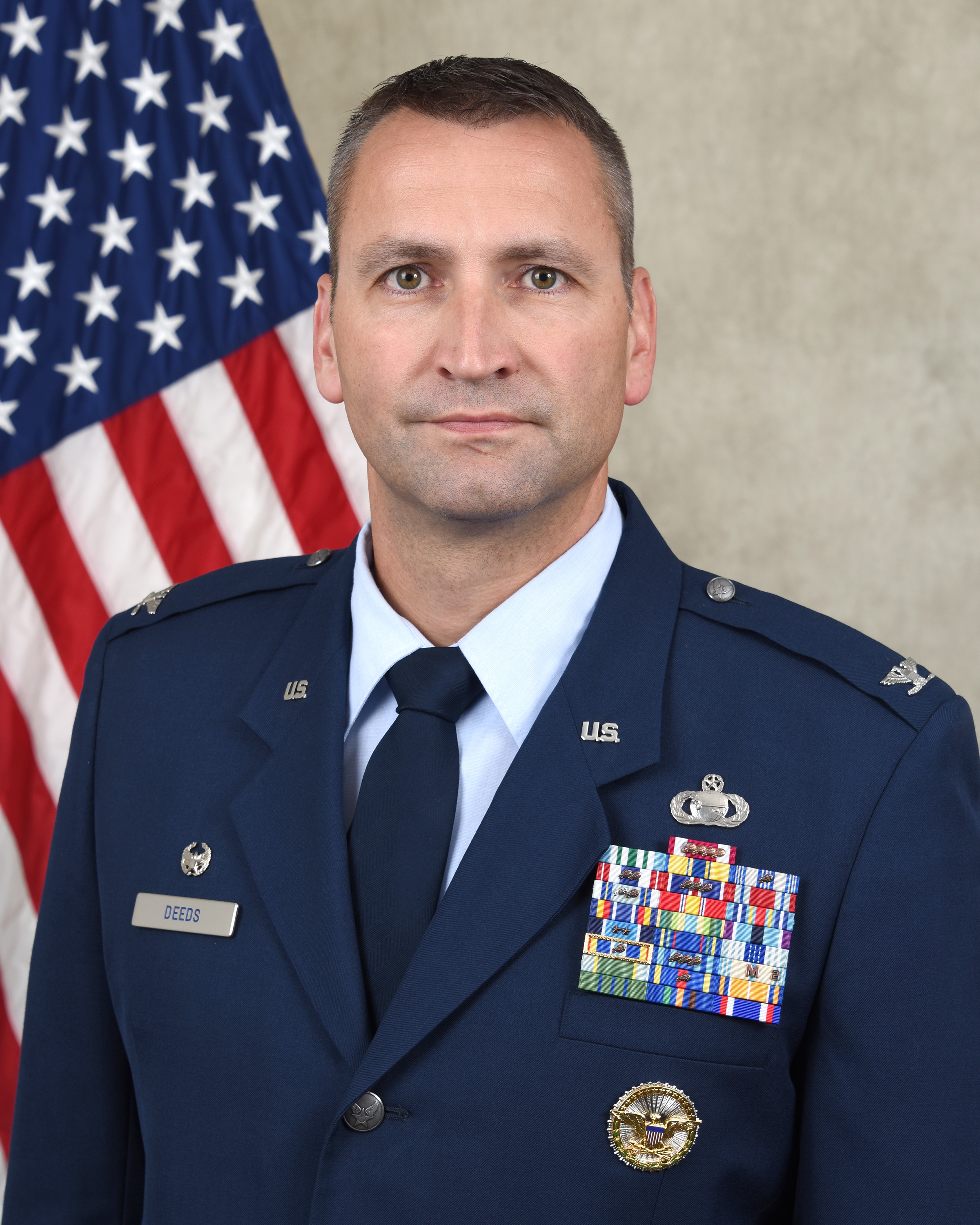 Col. Joe Deeds is the commander, 184th Wing, McConnell Air Force Base, Kansas. He is responsible for preparing the largest multi-domain wing in the Air National Guard in support of worldwide joint and coalition operations. The wing employs more than 1,300 Airmen, who conduct air battle management, air to ground special warfare, cyber protection, cyber vulnerability assessments, network security, and strategic and tactical intelligence. In addition, the wing fields a full complement of medical operations and mission support functions including civil engineering, contracting, force support, installation communication, logistics, and security forces. Col. Deeds also provides the governor of Kansas with over 1,300 Guardsmen trained and ready to provide domestic incident response in support of any crisis citizens of Kansas may face at their greatest time of need.