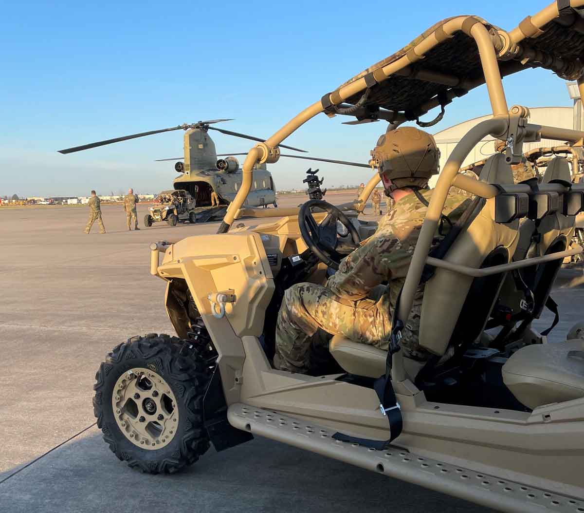 The 12-person class was divided into three teams for the combat scenarios. Each team assembled an equipment package that included four personnel, gear, weapons, rucks, a tent, food, and water that all had to fit onto a military-grade utility vehicle. They loaded their vehicle onto a CH-47 Chinook helicopter and were transported to insertion points at Fort Chaffee.