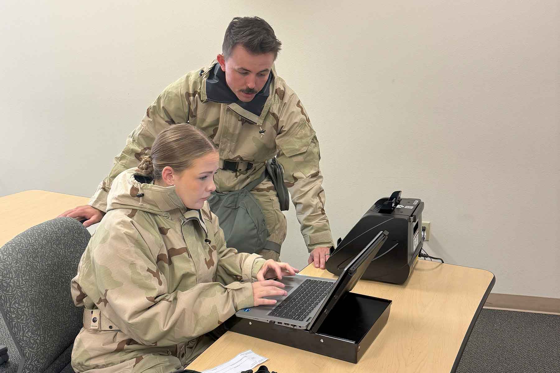 U.S. Air Force Staff Sgt, Michael Albright (left) and Tech. Sgt. Jesse Mark (right), 184th Comptroller Flight, Kansas Air National Guard, provide support during Exercise Sabertooth at Fairchild Air Force Base, Wash., Aug. 1-7, 2025. Exercise Sabertooth focused on simulating challenges Airmen would face in deployed environments and improving skills related to disbursing, budgeting, and operating in a high-stress environment. The exercise also included Chemical, Biological, Radiological, Nuclear attack simulations, and Tactical Combat Casualty Care drills. (US Air National Guard photo by 184th Comptroller Flight)